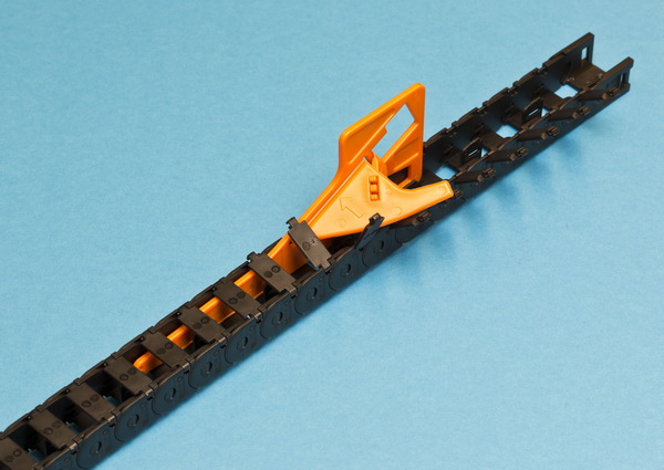 The E2 family is available in three versions: one-piece with enclosed chain links, and two-piece, with crossbars that can snap open to the outside or inside. The snap-open crossbars allow chains to be quickly and conveniently filled. In addition to the well conceived design, igus has developed a tool for even faster and more convenient assembly: the handy plastic chain opener is equipped with side tabs that release and fully pivot open all cross bars within seconds. This reduces assembly time tenfold. The igus opening tool is included with every customer order.