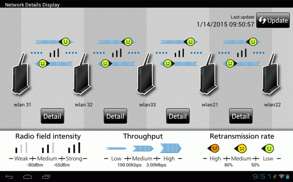 Wireless surveillance camera Mitsubishi Electric's visualization software is a simple user interface for monitoring the wireless channels. It instantly visualizes signal conditions and possible breakdown locations to enable users to find the best locations for installing cameras. Even non-technical persons can build and operate a network.
