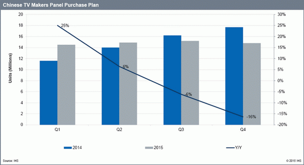 The top six TV manufacturers in China plan to purchase just 14.8 million LCD TV panels, including open cell and modules, in the fourth quarter (Q4) of 2015, which is a 16 percent year-over-year decline from the 17.7 million displays shipped in Q4 2014, the report says.