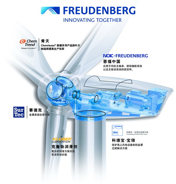 Beijing, October 15, 2015. China Wind Power (CWP) 2015, one of the key industry events for wind energy manufacturers to display their latest developments in technology and products, takes place in Beijing on October 14-16. As a leading global technology group, Freudenberg offers an extensive range of products, solutions and services in the wind energy sector. For the first time - five Freudenberg companies, Klüber Lubrication, NOK-Freudenberg China, Freudenberg Filtration Technologies, Chem-Trend and SurTec, are taking part in the conference together. All five Freudenberg companies are leading brands in specific wind energy segments and will be presenting their solutions for the domestic market.