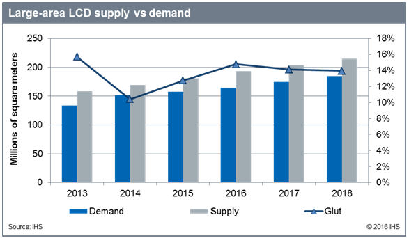 TOKYO, Japan (January 26, 2016) - The ongoing issue of liquid crystal display (LCD) oversupply -- exacerbated by China's aggressive investment in production capacity as well as high fab utilization -- will continue well into 2016. The supply of large-area LCD is expected to be 14 percent greater than demand in 2016, up from 12 percent in 2015, according to IHS Inc. (NYSE: IHS), the leading global source of critical informational and insight.