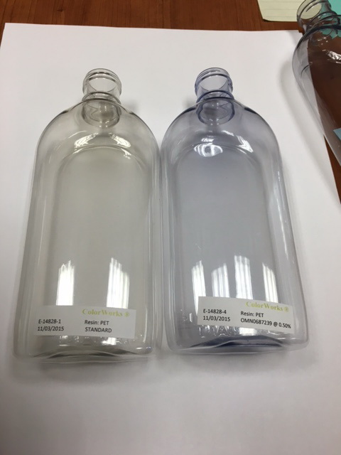 The new liquid additives were tested on a production scale blow-molding machine in Clariant's facility in East Chicago, IL. Bottles made using 25% recycled PET and 75% virgin PET and no brightening additive were compared against bottles made with the same PCR resin and the additive in concentrations of 0.025, 0.035 and 0.05%. While the unmodified bottles showed significant yellowing, all the bottles made with the HiFormer additive were visibly brighter (less yellow and more blue). This is evident in the following spectrophotometer readings: The data in the two tests are quite different due to the fact that the bottles tested were essentially transparent, but trend is the same in both Test 1 and Test 2: the blue value decreases as the concentration of the optical brightener increases. This indicates that less blue light is absorbed by the surface of the PET and more blue light is reflected toward the viewer's eye. "The human eye perceives yellowness as dirty or hazy, while blue light is seen as cleaner and clearer," explains Prusak. "What is most significant, and what is most exciting to me, is how we can shift that blue value so dramatically just 0.05% additive loading.