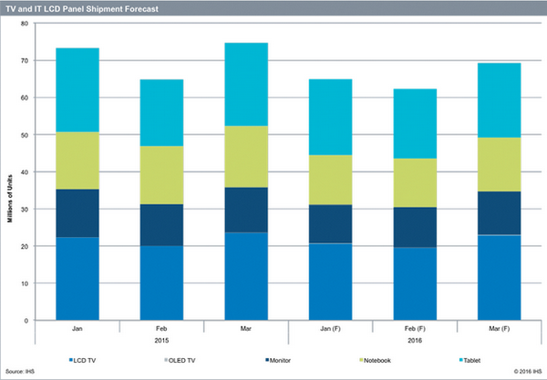 SANTA CLARA, Calif. (March 1, 2016) - Liquid crystal display (LCD) manufacturer inventory adjustments and continued slowing demand are causing TV and information technology (IT) display prices to fall, further eroding panel makers' profitability. TV and IT display shipments in the first quarter (Q1) of 2016 are expected to decline 8 percent compared to the same period last year, to register just 196 million units. This is the first time since 2009 that panel shipments have declined in the first quarter year over year, according to IHS Inc. (NYSE: IHS), the leading global source of critical information and insight.