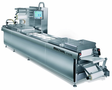 At the Anuga FoodTec in Cologne MULTIVAC will be presenting its R 535 high performance thermoforming packaging machine for the production of 'PrePack' packages. The R 535 is equipped with a folding station and a MR 635 cross web labeller. Downstream from the R 535 will be a MBS 110 converging system with inte-grated metal detector for converging the packs. The R 535 offers a simple die change and easy access to the dies thanks to its innovative drawer system and electrically hinged dies.