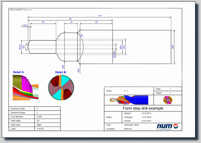 March 14, 2012 --- Tool manufacturers can now automatically create dimensioned engineering drawings of machine tools showing their precise geometry, by using a new facility for NUM's renowned NUMROTO grinding software. By producing cross-sectional views of a tool - at any position along its length - the new NUMROTO Draw function can effectively automate production verification. The drawings can also incorporate images obtained directly from 3D simulation of a tool, enabling even complex grinding details to be portrayed graphically and unequivocally.