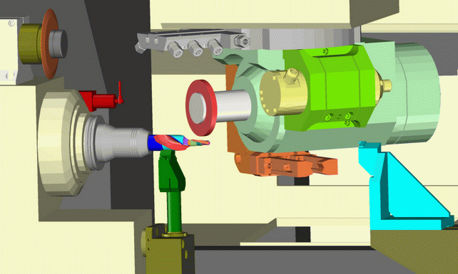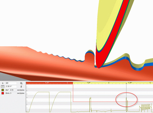 NUMROTOplus software uses detailed graphical and colour images to show the grinding process - here a milling cutter wheel will overheat unless the user modifies the program Provided that the NUMROTO program also includes the grinding wheel data, NUMROTO Draw can process this information to create 3D details and integrate them with the drawing. The 3D details can be represented as colour images or as wire frame models, and provide an extremely accurate portrayal of the tool's profile or cross sectional geometry between or at any position(s) along its length.