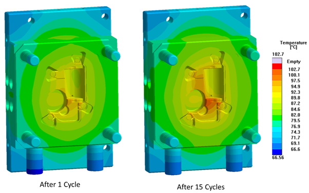Another of the advantages of multi-cycle simulation is the possibility to calculate how many production cycles are required for the mold to achieve cyclic equilibrium - and thus consistent quality conditions. Therefore, the number of parts required to produce before the production begins can be predicted. The system can be optimized to minimize the number of pre-production parts that are required. Another possibility is to compare the efficiency of different tempering systems, to understand how to achieve equilibrium more quickly or how to consume less energy.