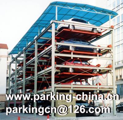 The equipment is designed with 5 levels with multi-rows and each level is designed with a space as an exchanging space. All spaces can be lifted automatically except the spaces in the first level and all the spaces can slide automatically except the spaces in the top level. When a car needs to park or release, all spaces under this car space will slide to the empty space and forms a lifting channel under this space. In this case, the space will go up and down freely. When it reaches the ground, the car will go out and in easily.