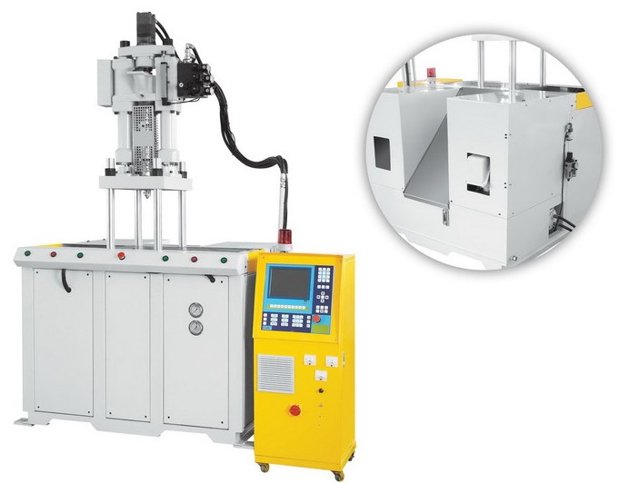 Vertical mode-locking and vertical injection machine. Covering a small area, easy to use, and no displacement when work piece is embedded. It is available for re-embedding small-and medium work piece.