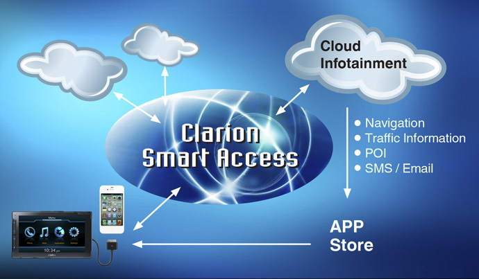 Clarion's "Infostructure" Provides Future-Ready Services Clarion helps your smartphone to be even smarter while on the road. Clarion "Smart Access" uses advanced cloud technology to help your smartphone access valuable information, and offers possibilities for future enhancement. Next GATE and its telematics service platform enables safe access to Internet based services and content from your iPhone in safety and comfort while in your vehicle.